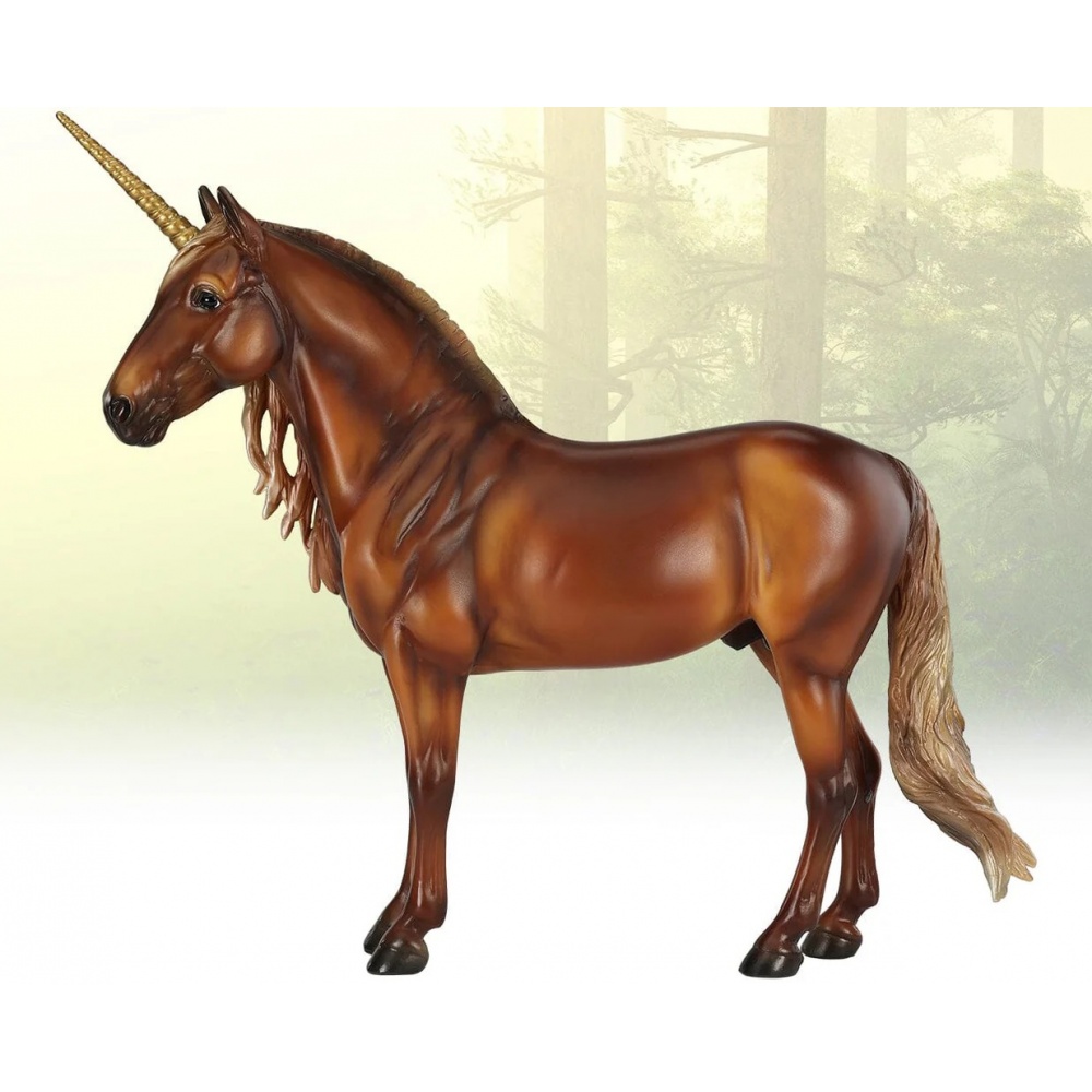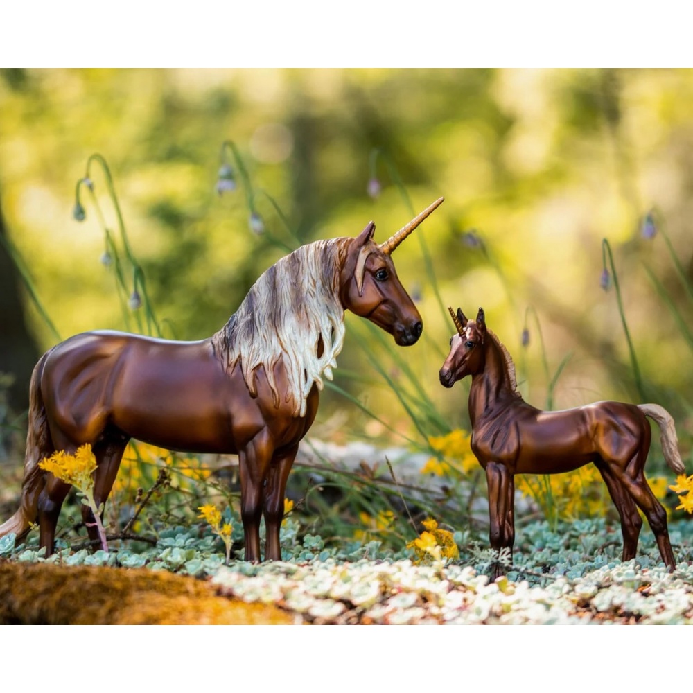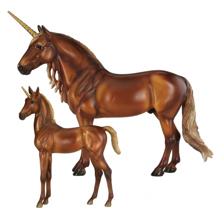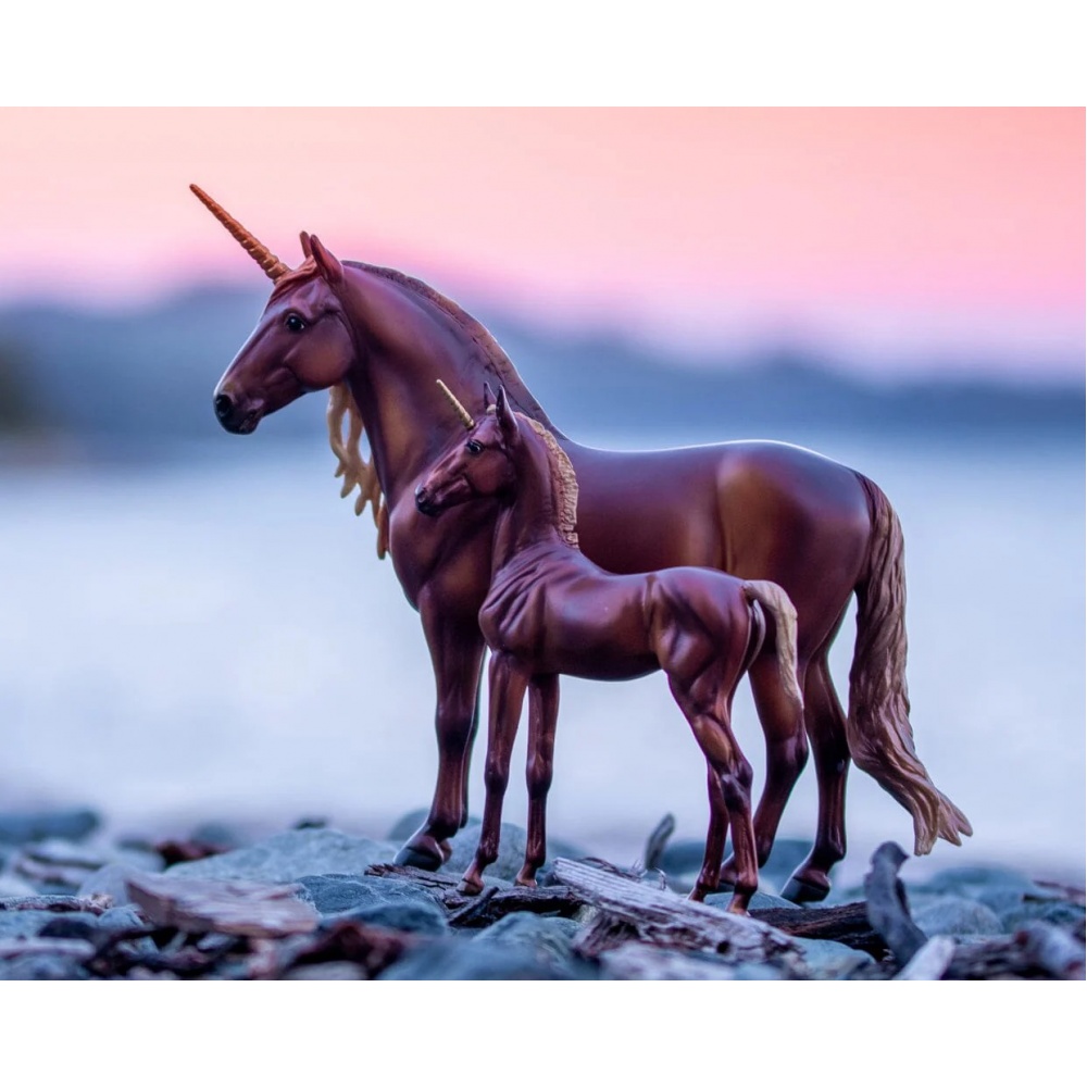 Розмір: 35×24 cm. Масштаб: 1:9. Гордий жеребець Сайрус та його відважна кобила Солана – нові єдинороги, що приєдналися до традиційної лінії! Ця чарівна пара хизується в однакових темно-золотисто-каштанових шубках з насиченим відтінком, що створює враження, що їх поцілувало сонячне світло. Їхні лляні гриви та хвости чудово доповнюють їхню вовну, а золоті копита та роги завершують їх міфічний вигляд.