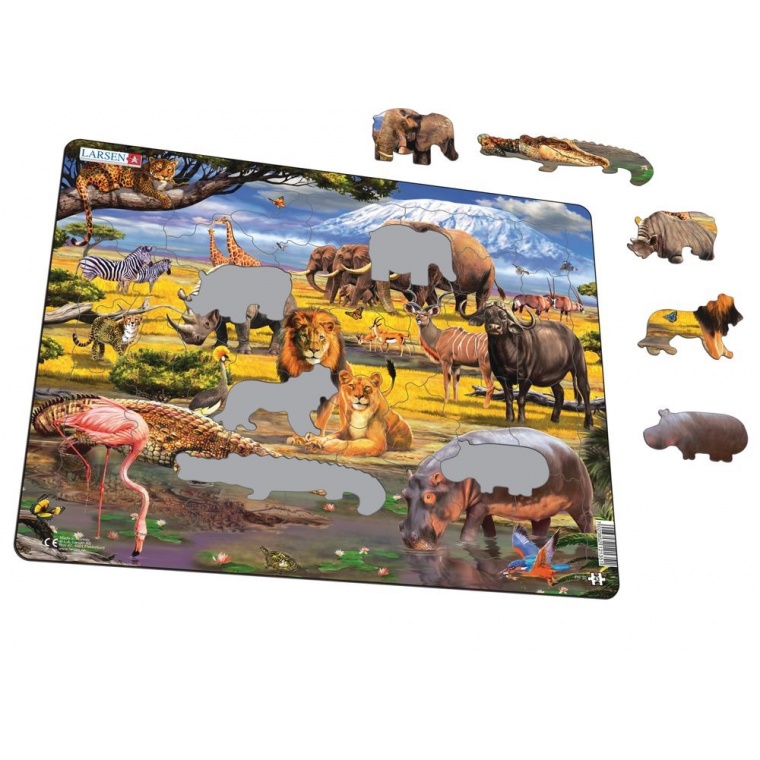 Кількість елементів: 43 штук; Матеріал: високоякісний картон; Розмір планшета: 36.5 х 28.5 х 0.5 см Пазли Ларсен направлені насамперед на навчання. Запрошуємо вас насолодитися нашою умиротворювальною головоломкою із зображенням дикої природи африканської савани. Ці африканські тварини насолоджуються повною свободою у цьому природному заповіднику. Головоломка складається з 43 деталей та ідеально підходить для маленьких дітей. Деякі з деталей мають зручну форму крокодила, носорога, метелика, слона, лева та бегемота, що дозволяє дітям самостійно розпізнавати фігури тварин. Серед мешканців савани — плямистий леопард, засмаглі жирафи, слони, довгоногий лелека (птах), пухнастий орикс (антилопа), смугасті зебри, носороги, потужні буйволи, гепард, газель Томсона, куду, сірий вінценосний крок. черепаха, зимородок (птах), не забуваючи про короля джунглів - леве. Брудні води на цьому мальовничому пазлі охолоджують тварин, готуючи їх до щоденного полювання, тоді як метелики та птахи ширяють високо в небі.