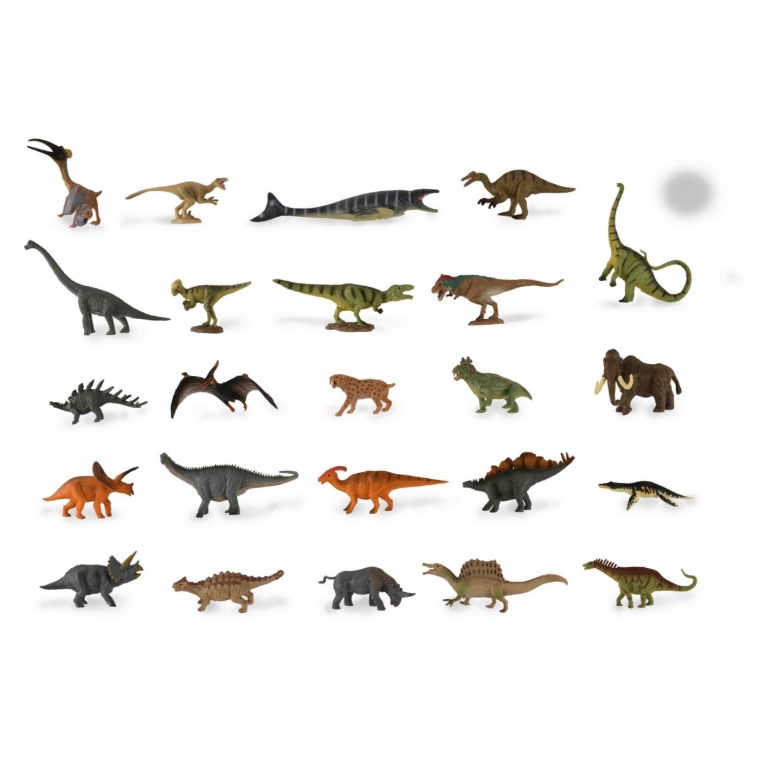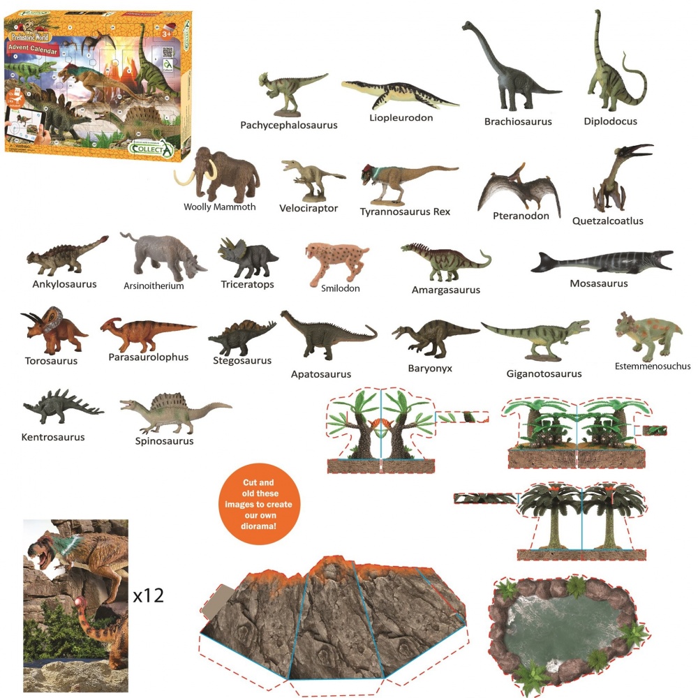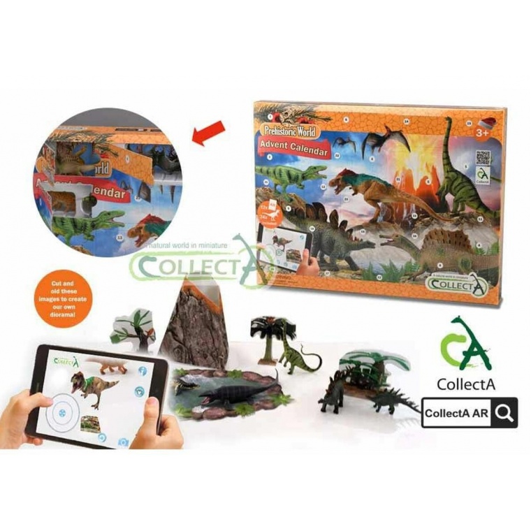 Різдвяний адвент календар - це набір міні-динозаврів з доповненою реальністю CollectA - це цікаве інтерактивне заняття, яким можна насолоджуватися на власному пристрої. Цей дивовижний пакет доповненої реальності включає 12 карт доповненої реальності і 24 мініатюрних фігурок динозаврів (Pachycephalosaurus, Liopleurodon, Brachiosaurus, Diplodocus, Woolly Mammoth, Velociraptor, Tyrannosaurus Rex, Pteranodon, Quetzalcoatlus, Torosaurus, Parasaurolophus, Stegasaurus, Apatosaurus, Baryonyx, Giganotosaurus, Estemmenosuchus, Kentrosaurus, і Spinosaurus). Також у набір входять паперові картки з пейзажами для створення кумедної інтерактивної діорами.
