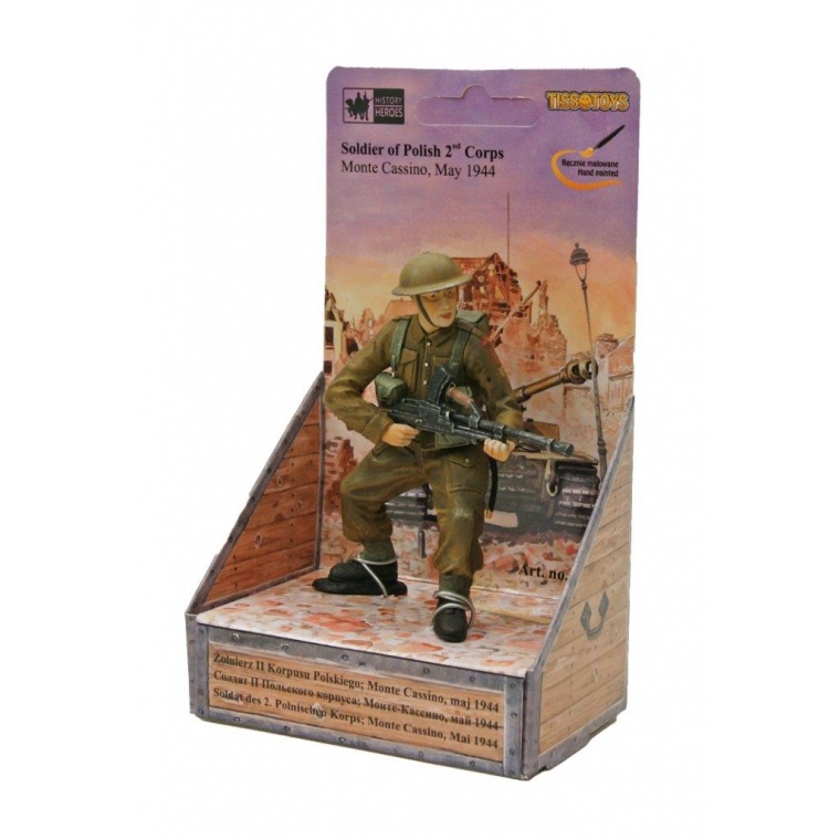 II Польський корпус був створений у липні 1943 року на базі Війська Польського на Сході (командувач генерал Владислав Андерс). Брав участь в італійській кампанії, борючись у масиві Монте-Кассіно, недалеко від Анкони та Болоньї (1945). Солдат у штатній польовій формі британського зразка, так званого Бойовий одяг, представлений незадовго до початку Другої світової війни. Брезентове спорядження, що складається з основного ременя, обв'язування, пари універсальних підсумків, чохла для їдальні, рюкзака. Каска типу Mk II на голові. На основному поясі складана лопата/кирка та багнет для гвинтівки Lee Enfield Mk III. На правому рукаві форменої куртки є знак Польща та розпізнавальні знаки 2-го корпусу (Варшавська Русалка) та 5-ї Кресової піхотної дивізії (Зубр), однієї з трьох тактичних частин корпусу (решта: 3-а Карпатська стрілецька дивізія та 2-а танкова бригада). Він озброєний 7,7-мм ручним кулеметом Bren із магазином на 30 набоїв.