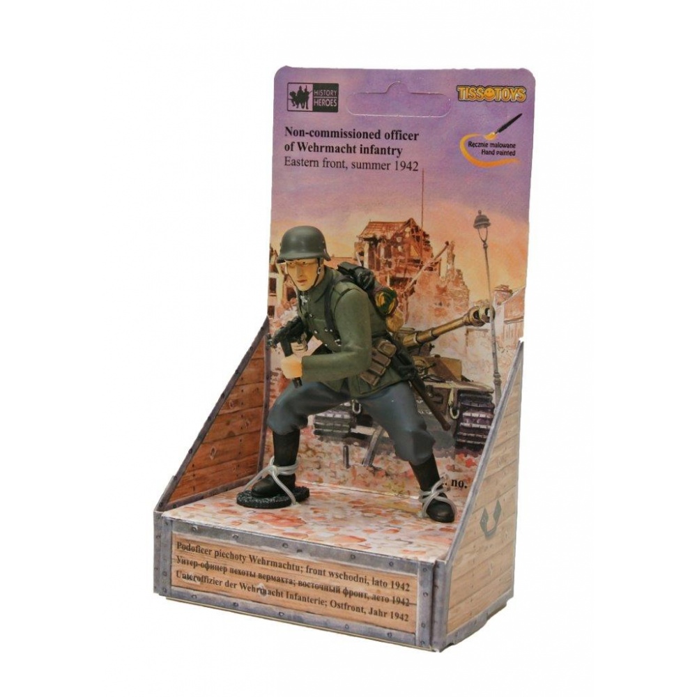 Солдат у сіро-зеленій форменій сорочці по викрійці 1936 (застібається на 6 гудзиків). Над правою верхньою кишенею державний герб Третього рейху, білі смуги на темно-зеленому комірі (знак піхоти). Спорядження складається з шкіряного основного ременя та ременя для перенесення, до складу спорядження входять: казанок, маскувальна палиця, сумка для приладдя, фляга в тканинному чохлі та лопата (переноситься зі багнетом). На головному поясі є два брезентові підсумки для трьох магазинів для пістолета-кулемета MP 4 9mm, який використовується солдатом (кожний магазин вміщує 32 патрони). Автоматами були озброєні, серед іншого, командири відділень, але основною зброєю залишалася класична гвинтівка із поздовжньо-ковзним затвором - Mauser 98k. На голові шолом за зразком 1935 року, прогулянкові шкіряні черевики з почорнілої волової шкіри.