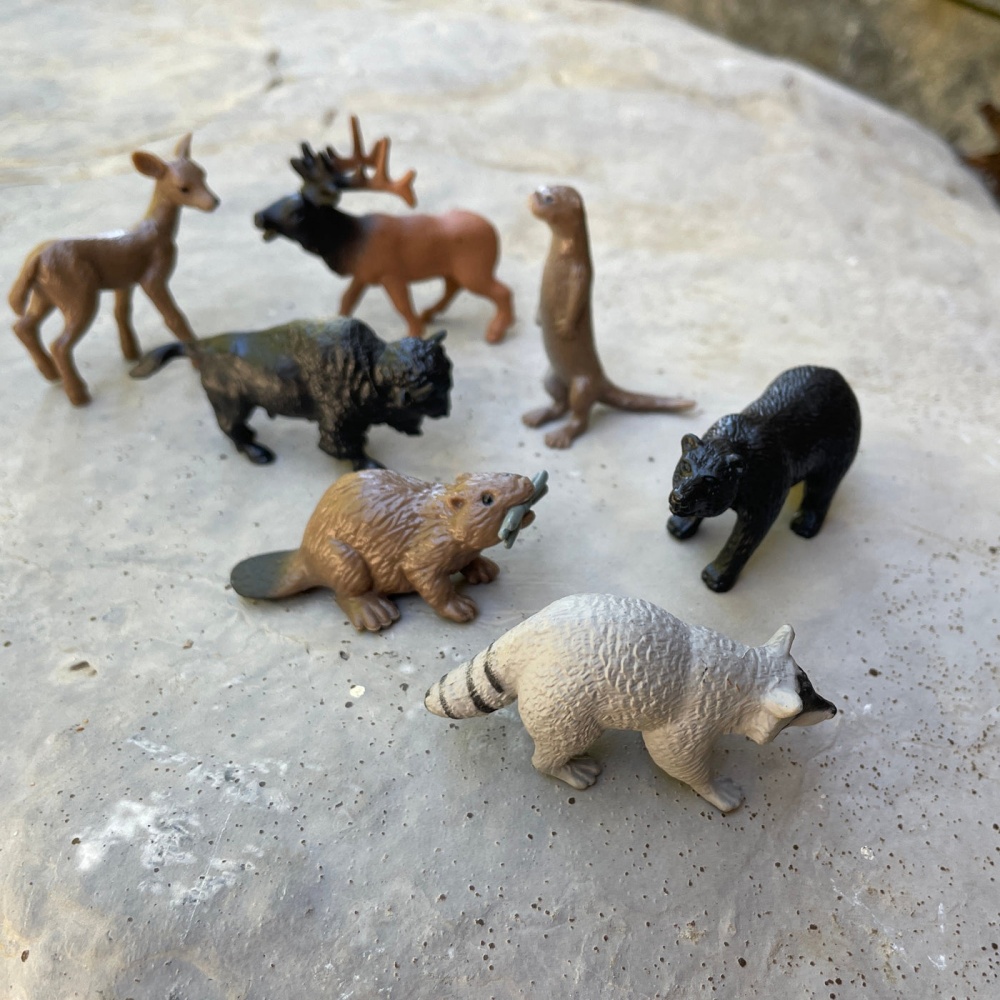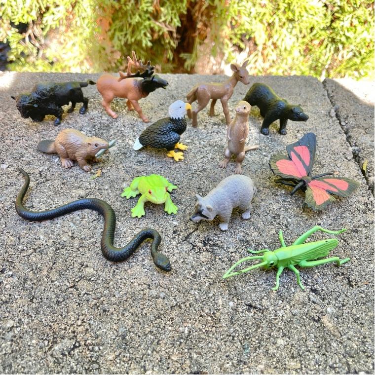 Набір з 12 фігурок тварин, що мешкають у лісах. Лось, канадська видра, метелик-монарх, чорний ведмідь, водяний щитомордник, білоголовий орлан, бобр, козуля, жаба, коник єнот-смужник і бізон стануть чудовим доповненням для сюжетних ігор. Завдяки грі з ними, малюки навчаться розуміти важливість живої природи, необхідності її збереження, а також розширить свій світогляд.
