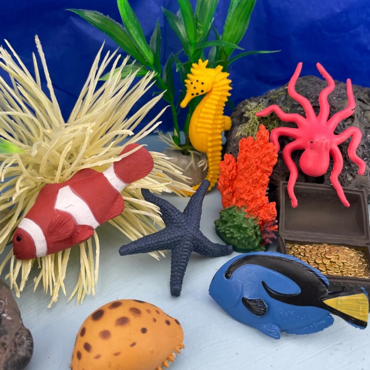 Набір включає 11 морських фігурок: восьминіг, морська зірка, морський коник, риба-клоун, риба-папуга, риба-янгол, блакитний хірург, черепашка, корал, а також аквалангіст і скриня зі скарбами, які стануть відмінним доповненням для сюжетних. ігор. Завдяки грі з ними, малюки навчаться розуміти важливість живої природи та необхідності її збереження.