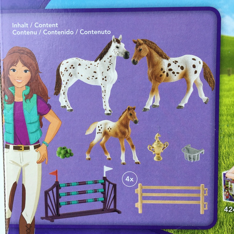 1 кобила породи аппалуза, 1 мерин породи аппалуза, 1 коня породи аппалуза, 4 загони, 1 ясла, 1 яблуко, 1 перешкода, 1 кубок переможця