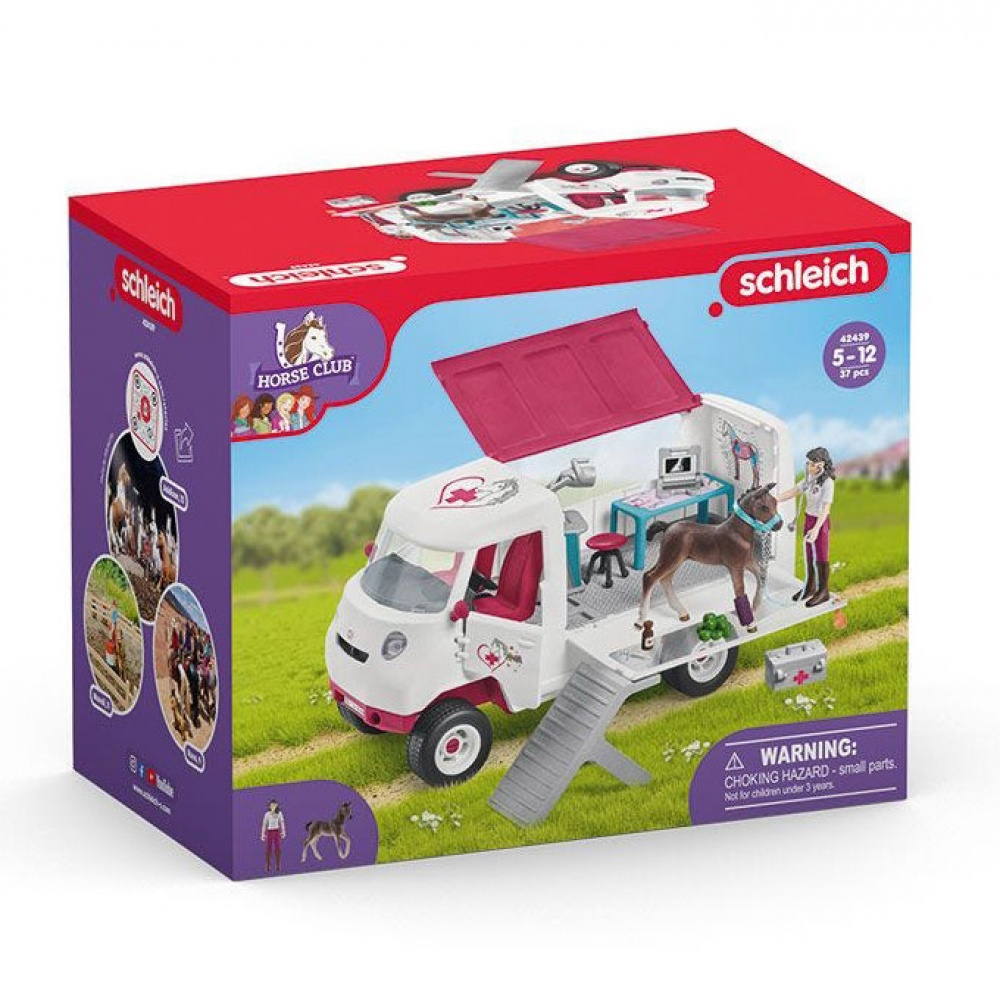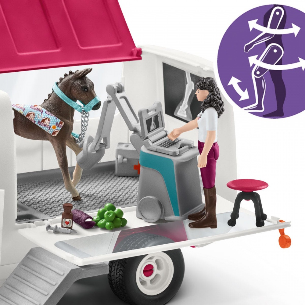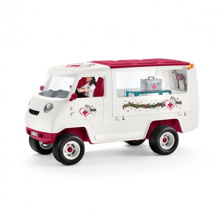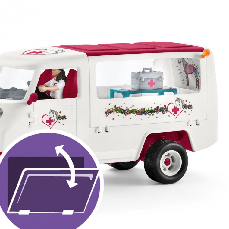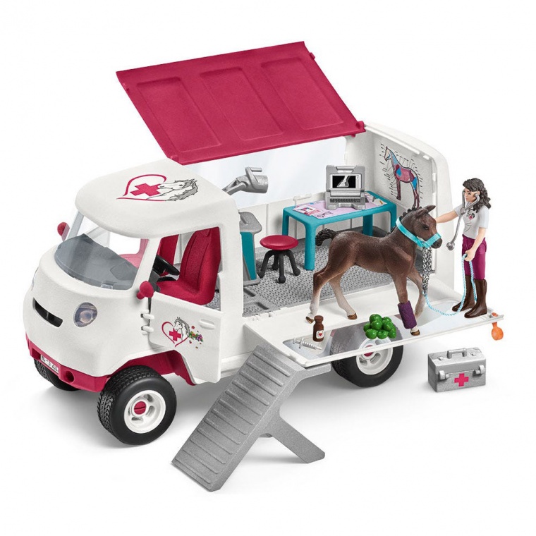 Вміст: 1 ветеринарний мобільний фургон, 1 ноутбук, 1 контейнер на коліщатках, 1 стетоскоп, 1 лікарська валізка, 1 шприц, 1 бинт, 1 компактна присипка, 1 лоша, 1 повністю рухлива фігурка, 1 яблуко, 1 недоузд.