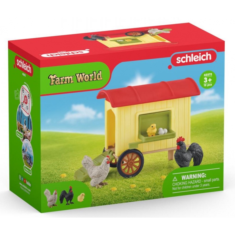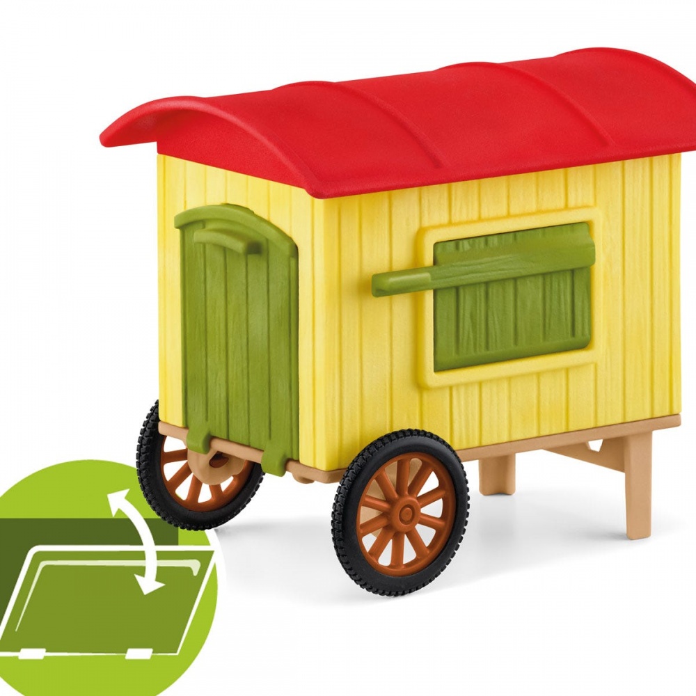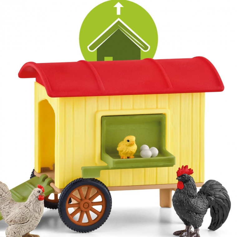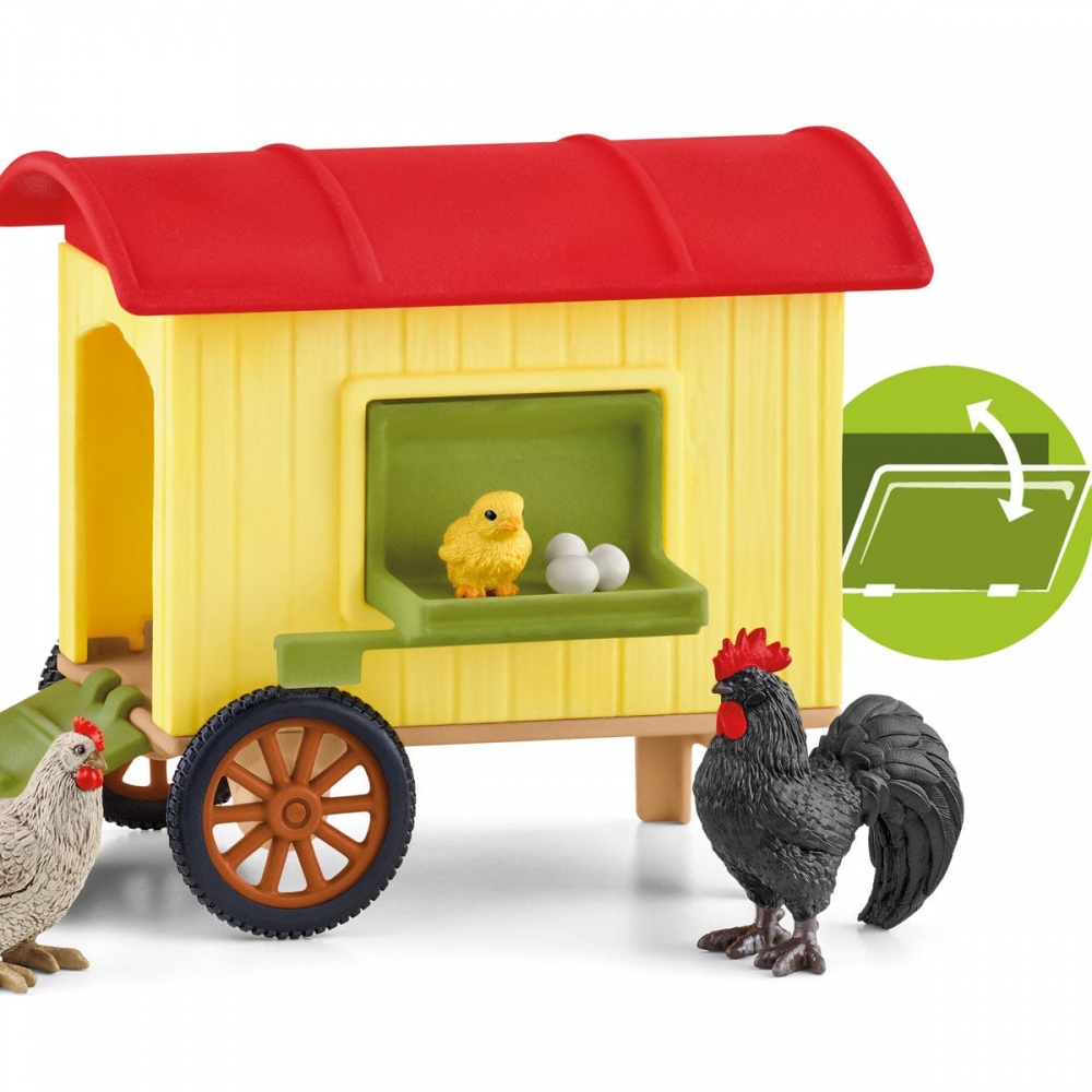 У наборі: 1x мобільний курник з боковими відкидними дверима, що відкривається рампою і люком, 1x півень, 1x курка, 1x курча, 1x яйця