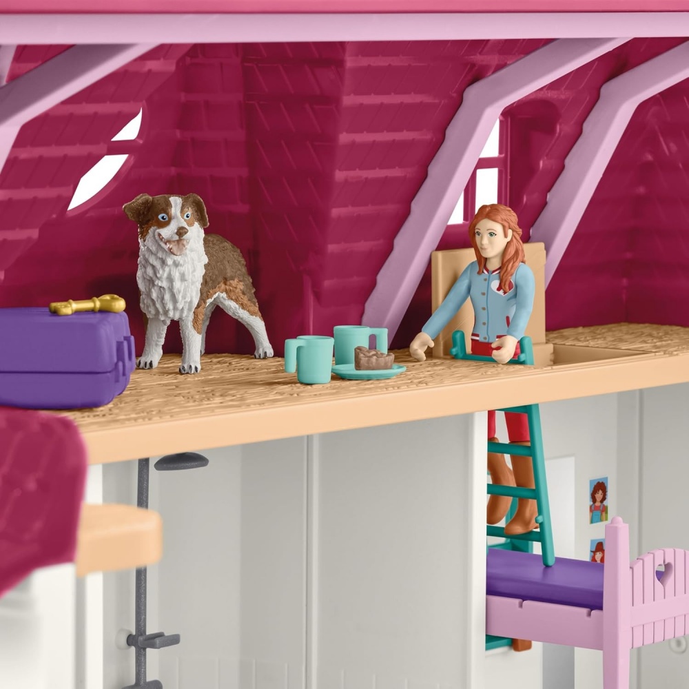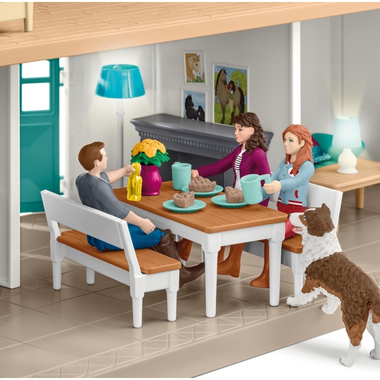 Вміст: 1x будинок, 1x стайня, 1x балкон, 1x фігурка містера Крамера, 1x фігурка місіс Крамер, 1x фігурка Ханни, 1x арабська кобила, 1x арабська лоша, 1x собака Рубі, 1x капелюх, 1x брас, 1x брас пітник, 1x вуздечка з поводами, 1x прив'язна жердина, 1x тримач шланга з водяним шлангом, 2x прапори, 1x фонтан, 3x стрічка переможця, 1x ящик для грумінгу, 1x скребниця, 1x щітка для тіла, 1x червоний сіна, 1x тюк соломи, 1x зелені яблука, 1x відро, 2x годівниці, 2x напувалки, 1x сіно для списа, 1x велика годівниця, 1x шолом, 1x зв'язка моркви, 1x вила, 1x двоспальне ліжко з матрацом, 2x ліжка, 2x односпальне ліжко з матрацом, 2x подушки для односпального ліжка, 2x ковдри для односпального ліжка, 1x ліжко, 1x ліжко, 1x унітаз, 1x раковина, 1x душ, 1x мийка з духовкою, 1x холодильник, 1x лава, 1x дерев'яний ящик, 4x шматка яблучного пирога, 1x ключ, 4x тарілки, 4x чашки, 1x сковорода, 1x каструля, 2x пляшки, 1x камін, 1x диван, 1x стіл для вітальні, 1x торш. світло передпокою, 1x конячка-провісник, 1x полонянка, 1x телескоп, 1x драбинка, 1 балконний столик, 2 балконні стільці, 1 парасолька від сонця, 1 валіза, 3 квіткові ящики з квітами, 2 листи наклейок