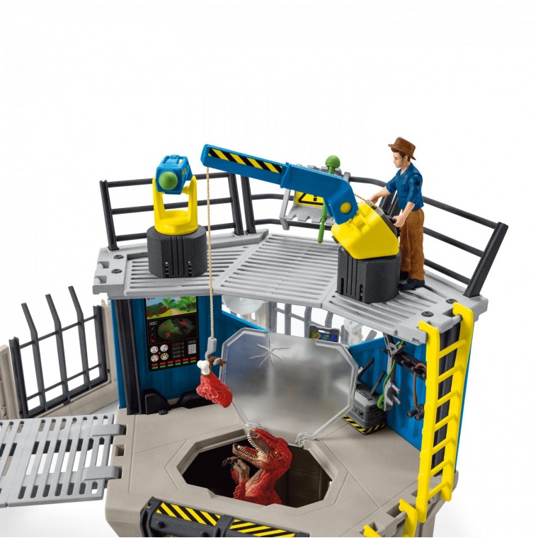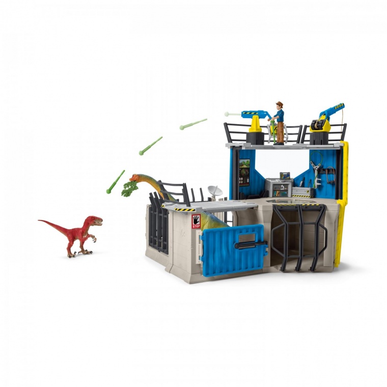 КОМАНДА ДИНО, що складається з 3 братів Колбі, МАКС, ЛУІС та ФЛІНН, прямує, щоб розкрити секрети! MAXX, лідер, має багато справ на великій дослідницькій станції динозаврів від Schleich® Dinosaurs. Крім командного пункту, на станції є оглядовий майданчик з поворотною стрілою, що оглушує, і краном. У нижній частині знаходиться карантинне приміщення для свіжовиловлених динозаврів. Тут одразу ж можна провести перші обстеження, а потім через люк впустити динозаврів у вольєр. О ні! Велоцираптор вирвався! Чи зможе МАКС знову зловити його своєю палицею? В ігровому наборі багато аксесуарів та 2 динозавра крутих кольорів.