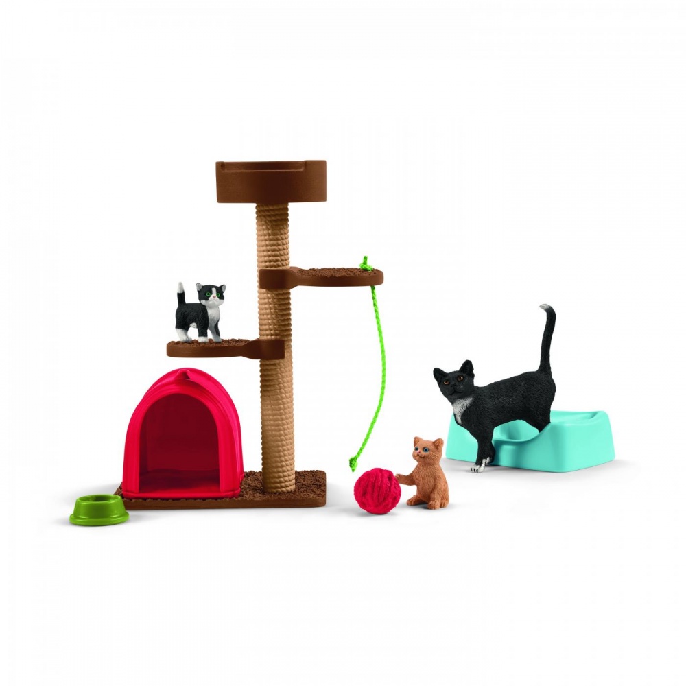 При ігрових забавах для милих кішок Schleich® Farm World миловидні кішечки грають з клубком вовни, граються на кігтеточці або ховаються у своєму будиночку. Після стільки розваг вони заспокоюються у своєму ліжечку. Кігтеточка може бути зібрана по-різному, і будиночок може бути розміщений за бажанням. Комплект містить три милі кішки та аксесуари.