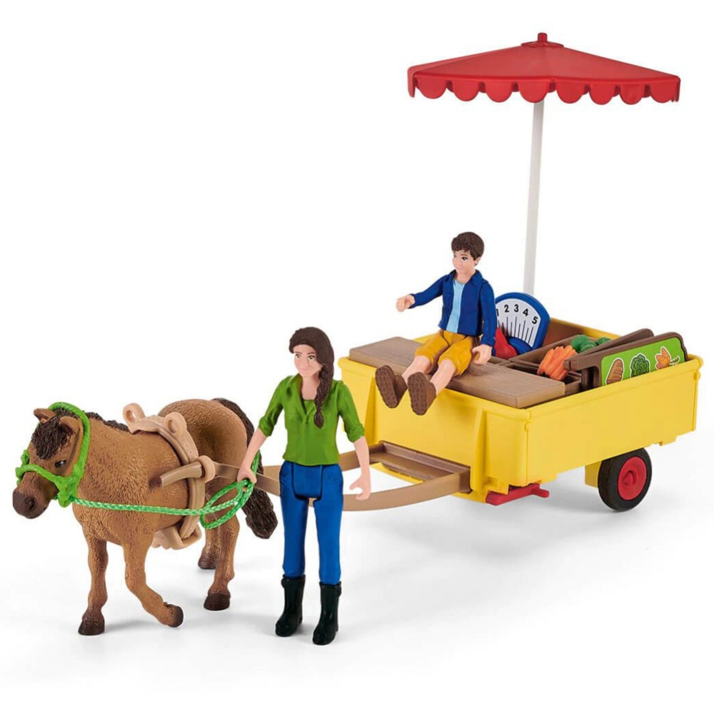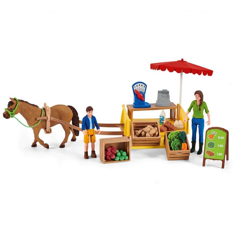 Вміст набору: 1x фермерка, 1x хлопчик, 1x кобила дартмур поні, 1x поясний ремінь, 1x мотузка, 1x недоуздок, 1x дишель, 1x причіп, 2x яблуко, 2x хліб, 2x салат, 2x картопля, 1x морська, 1x сонцезахисний козирок, 1x ваги, 1x пляшка для молока, 1x яйця, 3x дерев'яний ящик, 1x касовий апарат, 1x лава