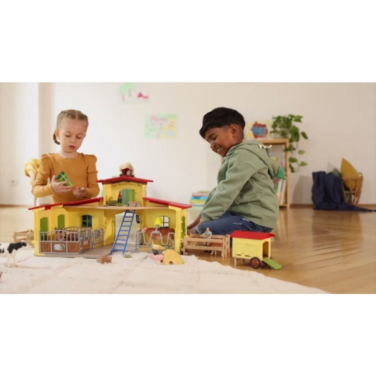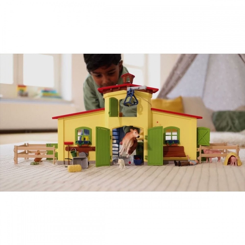 Вміст: 1x ферма, 1x фермер Підлога, 1x корова, 1x теля, 1x свиня, 1x порося, 1x кішка, 1x голуб, 1x миша, 1x голубник, 2x ящик для квітів, 2x вставки з соломи, 4x довго , 1x підйомний кран з тросовою лебідкою, 1x карусель для годування, 1x печера для сіна, 1x шланг для води, 1x сходи, 1x годівниця, 1x підставка, 1x миска, 1x пляшка для годування, 1x щітка для корів, 1x , 1x неїстівне сіно, 1x мітла , 1 тачка, 1 відро, 1 тюк соломи, 1 тюк сіна, 8 морква, 6 яблук, 1 яйце, 1 лист з наклейками