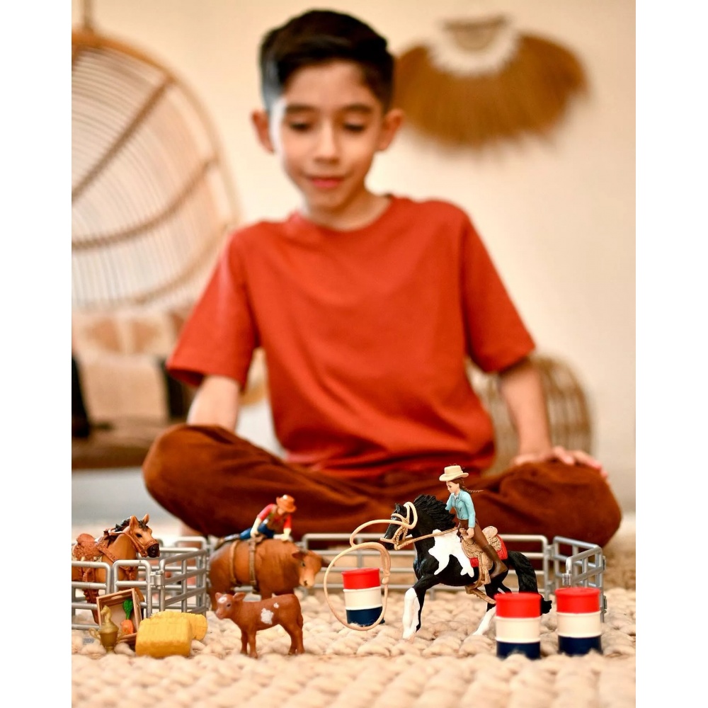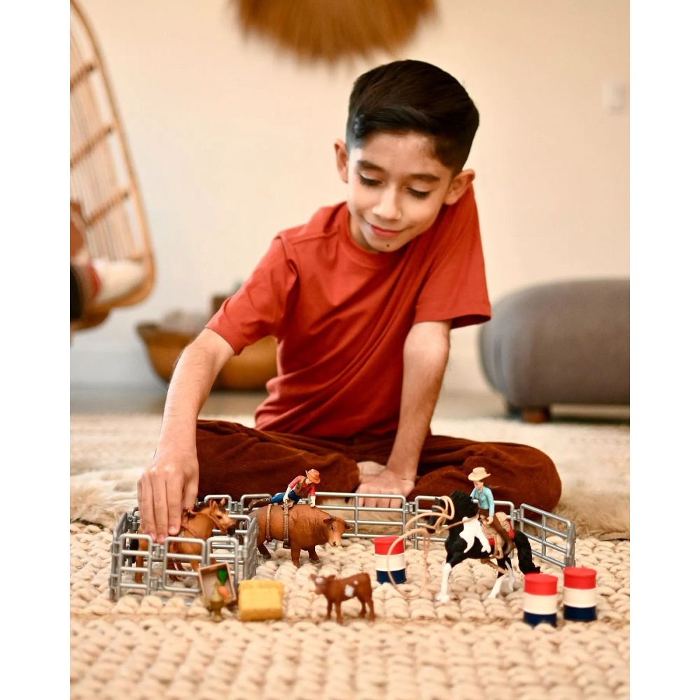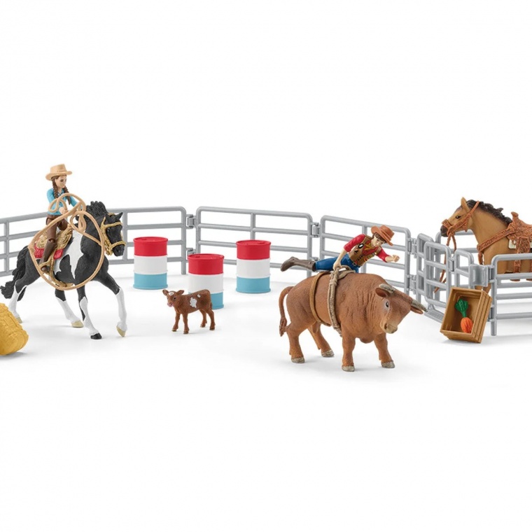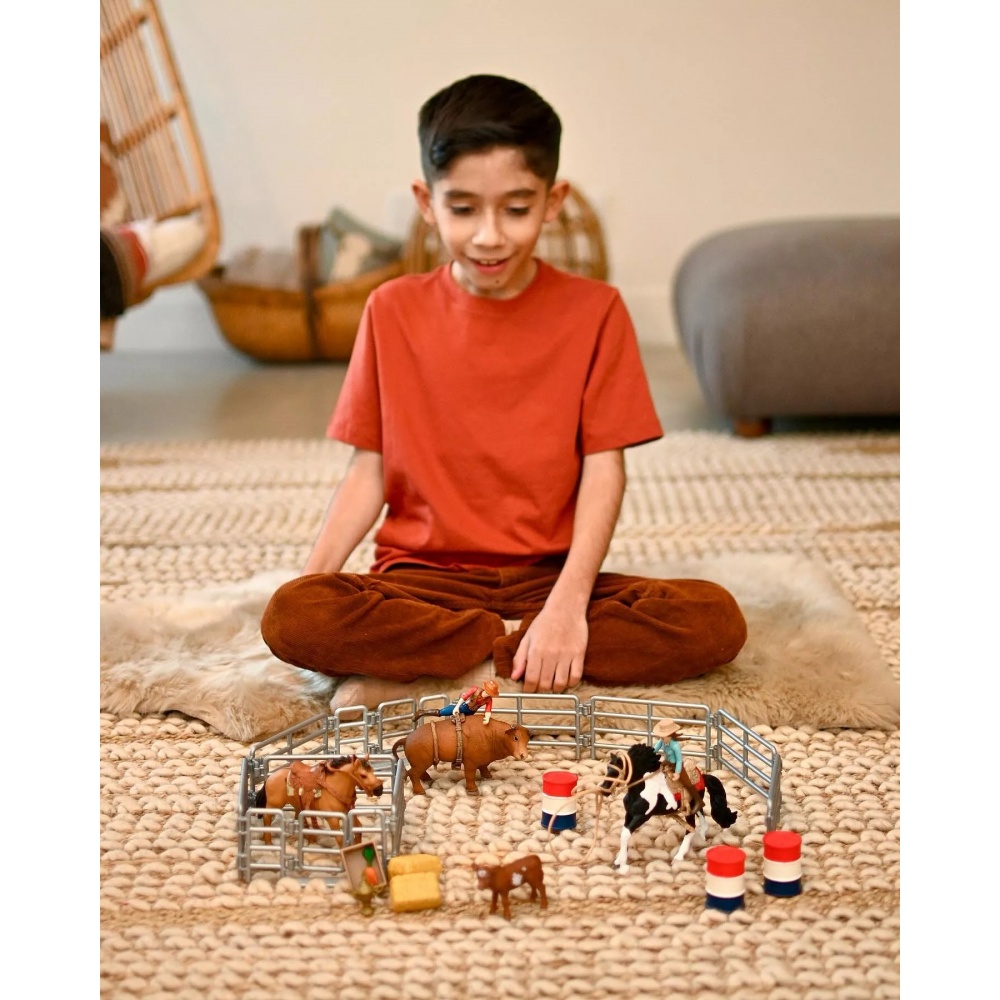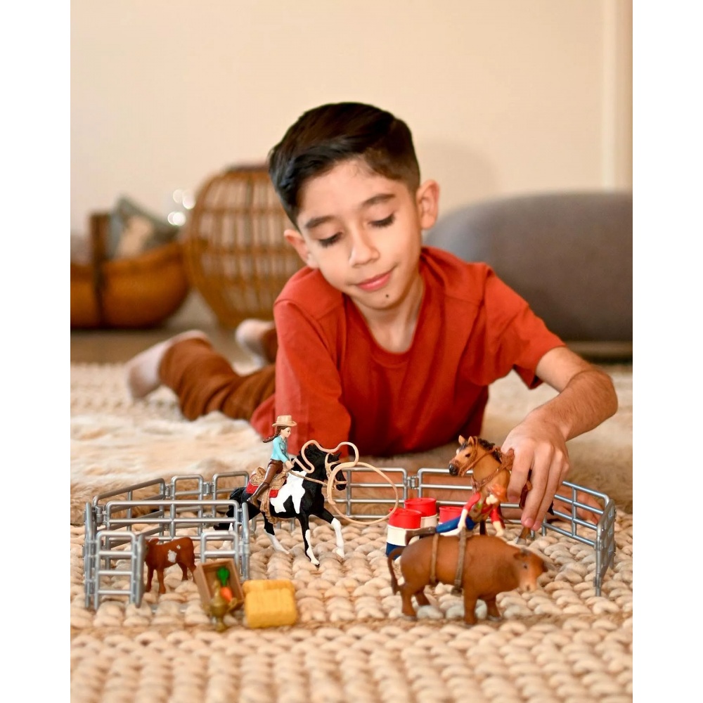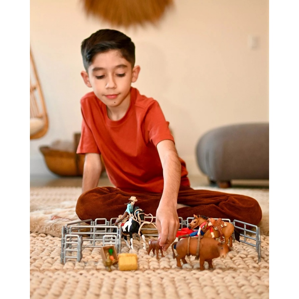 В ігровому наборі "Родео-шоу" від FARM WORLD все стає неймовірним. Бик хропе у своєму загоні. Сьогодні на ньому їздитимуть? Ковбой і ковбойша сидять на мустангу та чвертьхорсі. У командному полюванні вони намагаються заарканити маленьке теля техаського лонгхорна. Трофей чекає! Але тварини також отримують частування з годівниці.