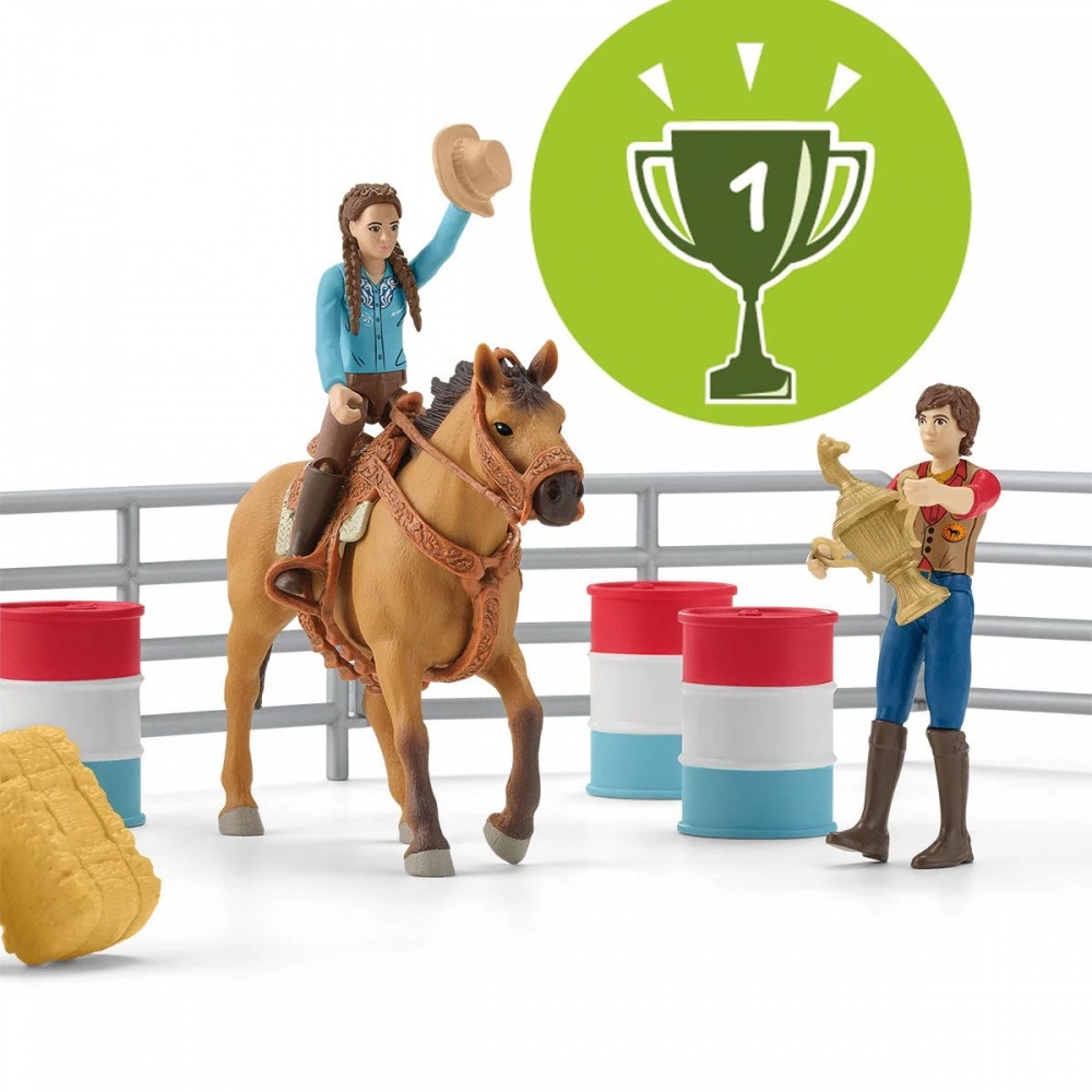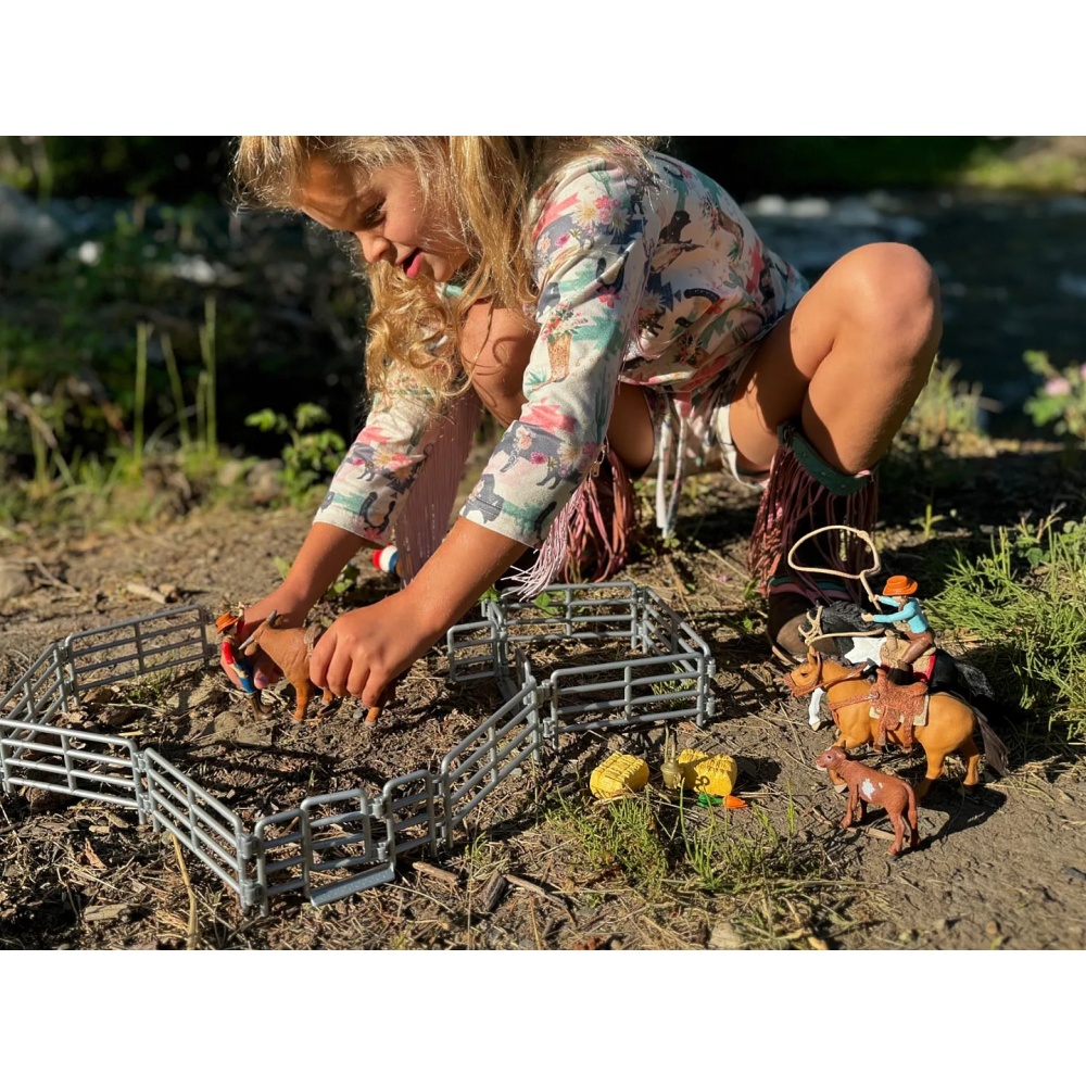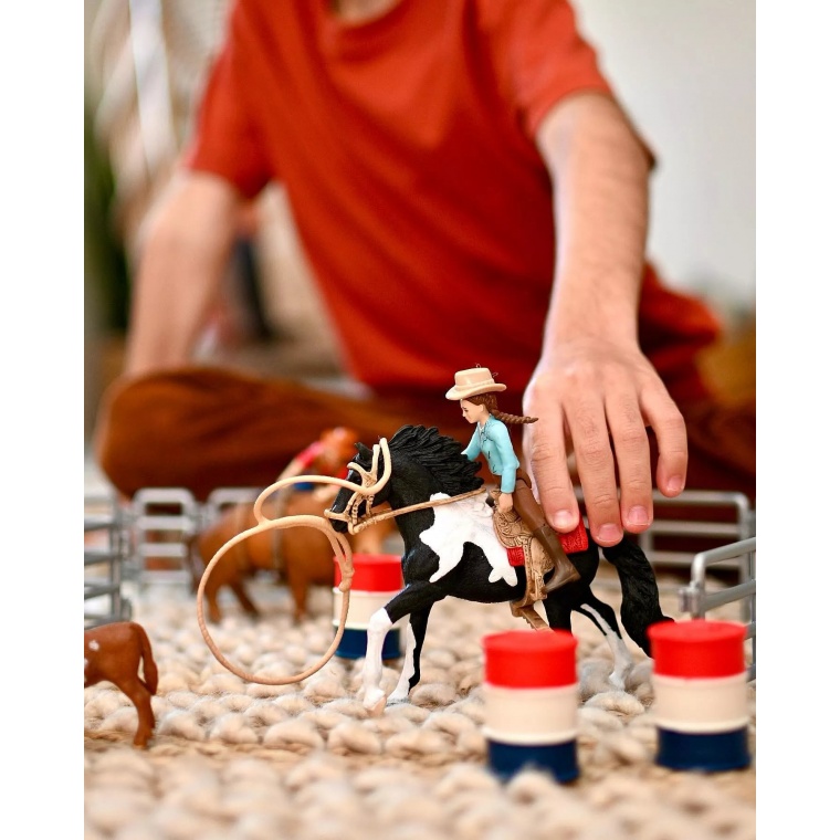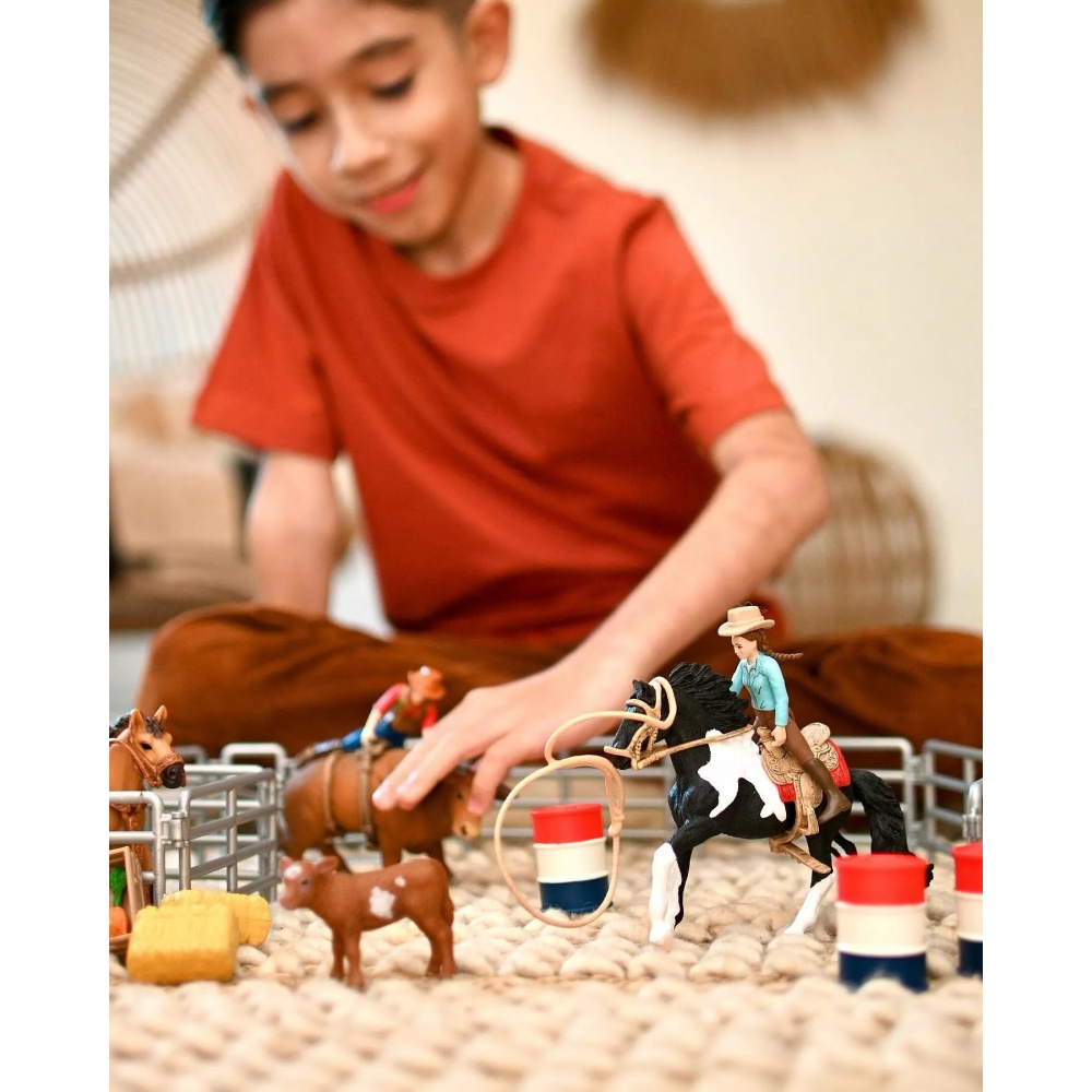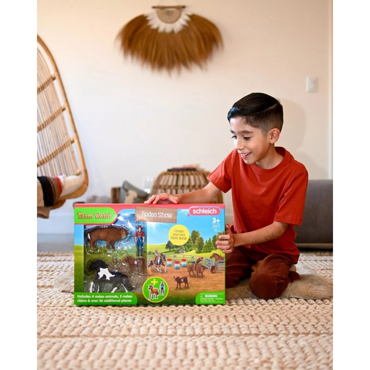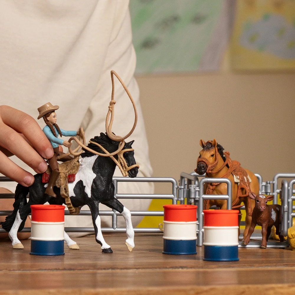 В ігровому наборі "Родео-шоу" від FARM WORLD все стає неймовірним. Бик хропе у своєму загоні. Сьогодні на ньому їздитимуть? Ковбой і ковбойша сидять на мустангу та чвертьхорсі. У командному полюванні вони намагаються заарканити маленьке теля техаського лонгхорна. Трофей чекає! Але тварини також отримують частування з годівниці.