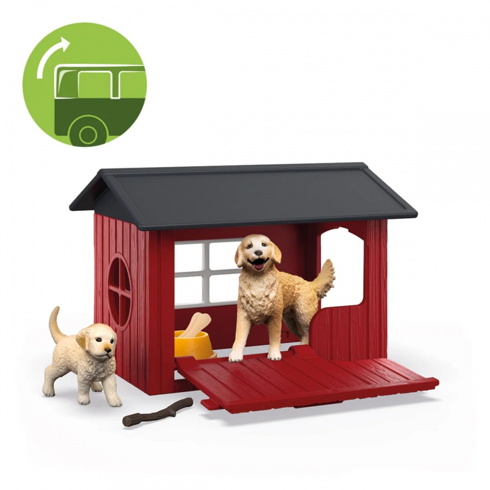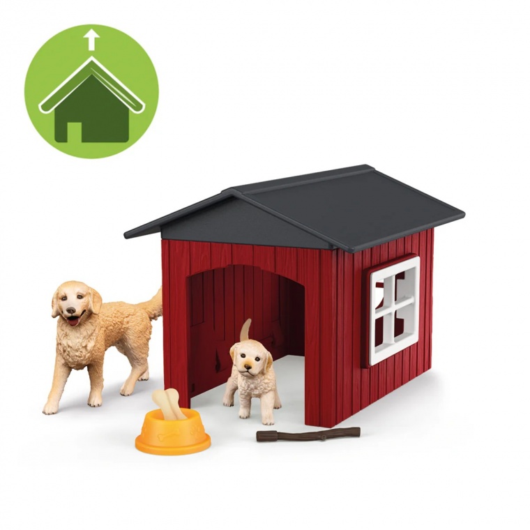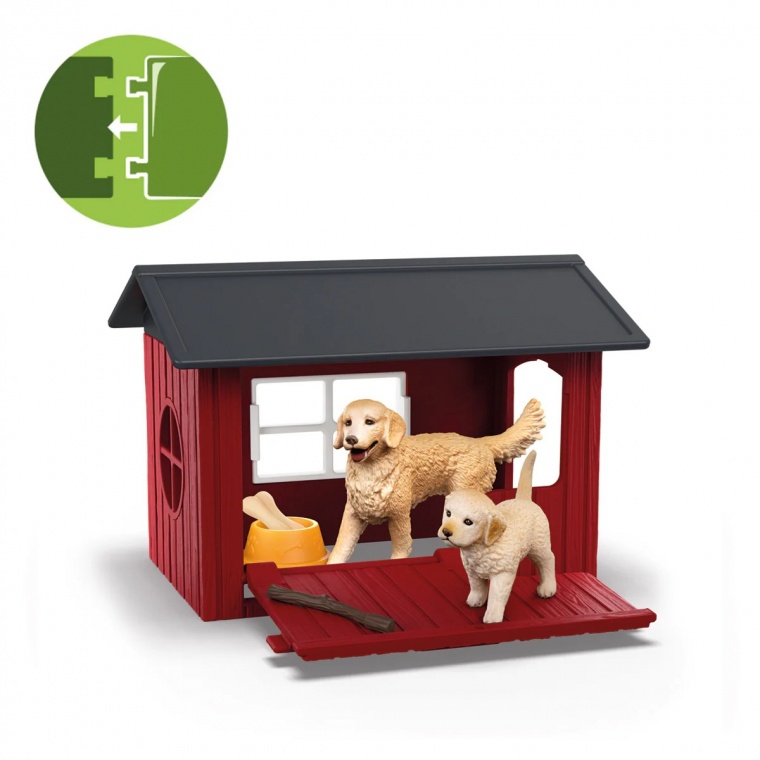 Розміри: 19 х 7 х 15 см. Новинка 2025. Вміст: 1x собача будка з бічною відкидною кришкою та двома вікнами, 1x самка золотистого ретрівера, 1x щеня золотистого ретрівера, 1x миска, 1x кістка, 1x палиця. Будь-який відвідувач ферми проходить повз собачу будку із золотистими ретріверами. Тут живуть сука золотистого ретрівера та її цуценя. Затишний! Хата побудована з червоного дерева та має дах антрацитового кольору. Вікна з боків пропускають багато світла. Коли чотирилапим друзям не потрібно приділяти увагу оточуючим, вони мають час погризти собачу кістку. Чудовий!