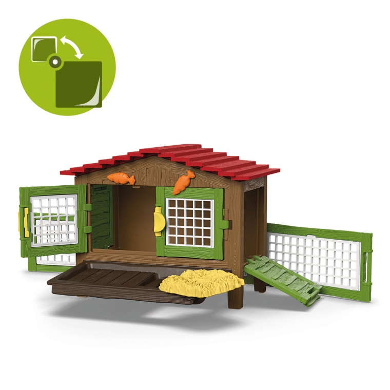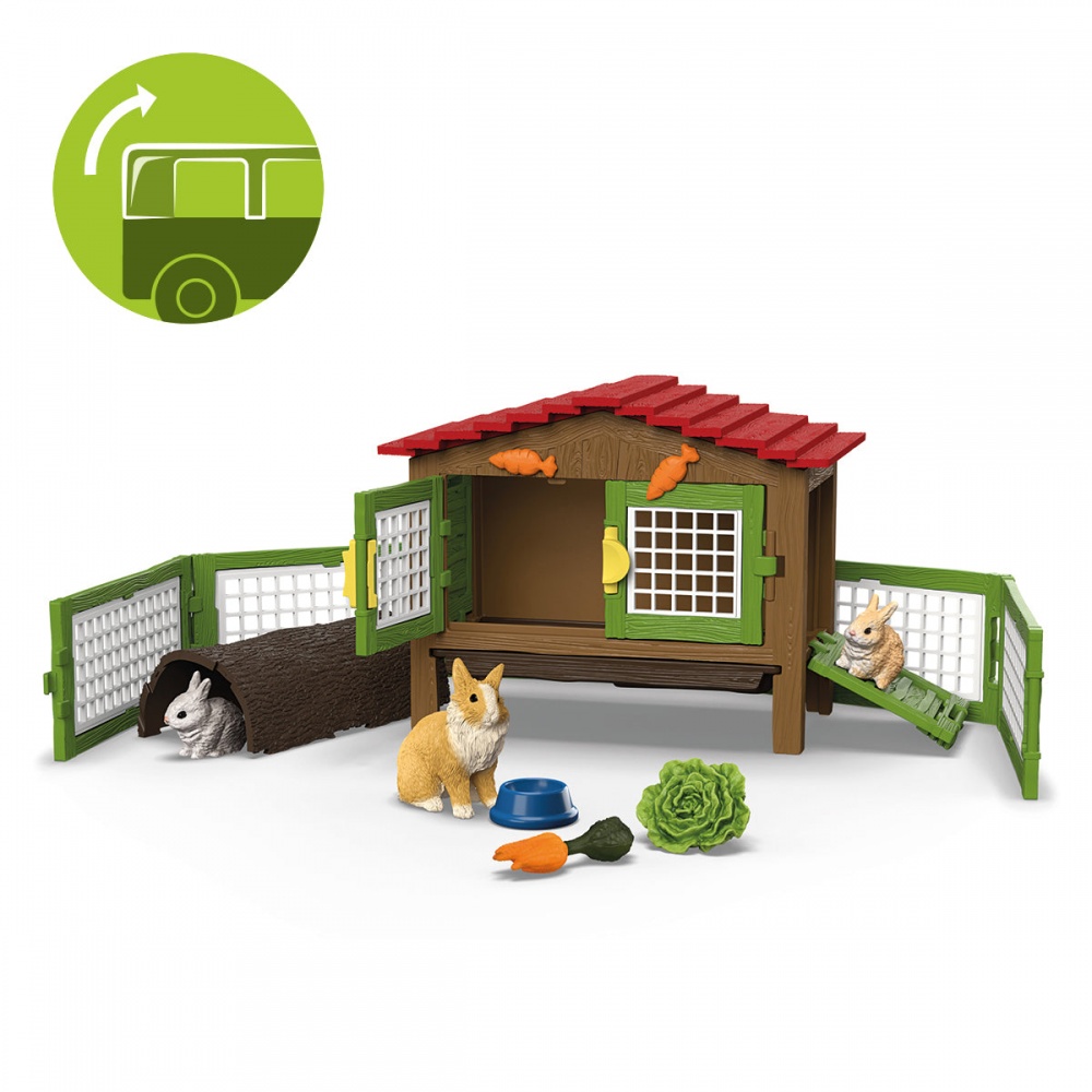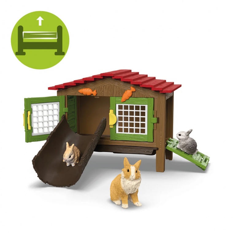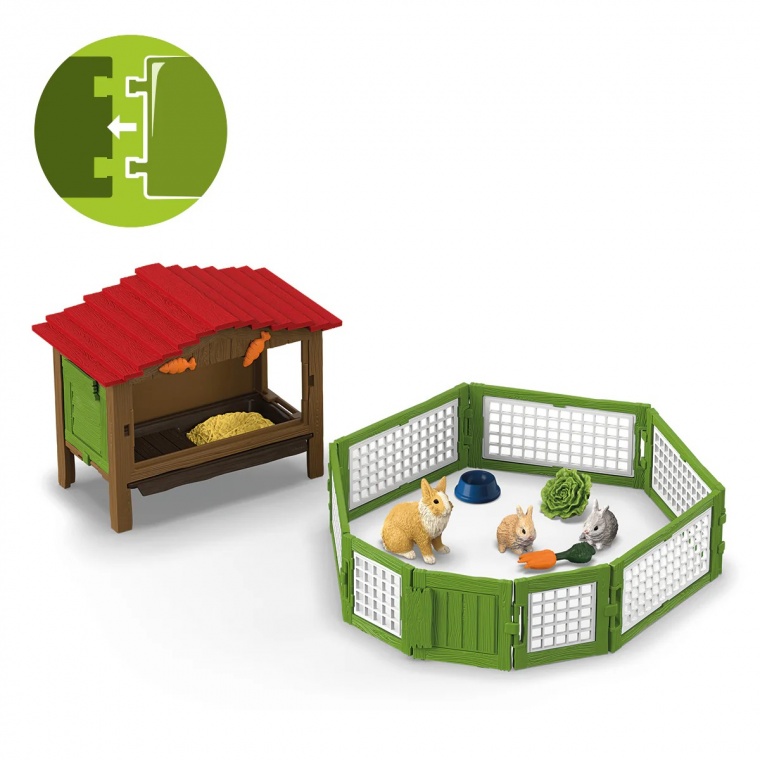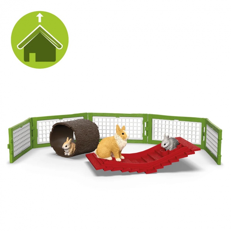 Розміри: 24,5 х 8 х 19 см. Новинка 2025. Вміст: 1 клітка для кроликів, 5 огорож, 1 кролик левиноголовий, 2 кроленят, 1 салат, 1 морква, 1 миска, 1 солома, 2 тунелі. У кролятнику львиноголовий кролик спостерігає за грою своїх двох дитинчат. В даний час вони використовують порожнистий стовбур дерева як тунель для повзання. Вони ще не виявили слайдів. Мама-кролиця дуже рада цьому, тому що вона не хоче, щоб двоє кроленят грали занадто бурхливо. Вона намагається залучити своє потомство хрумкою морквою. Хоча запах чудовий, двоє малюків воліли б продовжити гратися. Можливо, із салатом їй пощастить більше?