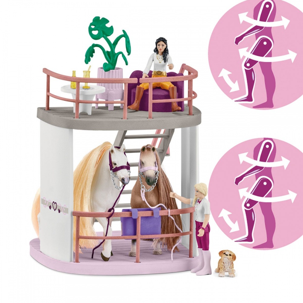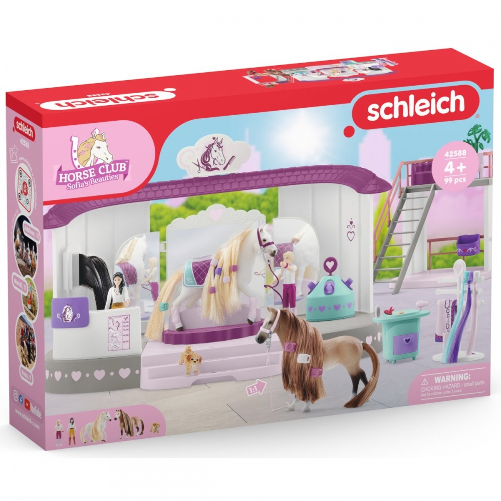Вміст: 2x коні з гривою і хвостом, 1x щеня мальтипу, 1x повністю рухлива фігурка Софії, 1x повністю рухлива фігурка місіс Лопес-Мітчелл, 1x салон з поворотним столом і зоною очікування, 24x шпильки для волосся, 2 , 1 дзеркало, 1 прилавок, 1 карусель, 1 перукарський візок, 1 стійка для корму, 1 рослина в горщику, 1 фен, 1 гребінець для пальців, 1 губка для пальців, 1 гребінець для пальців, 1 щітка для пальців, 2 ло , 3 пасма волосся з шпилькою, 1 грива і хвіст, що розчісується, 1 торговий стенд, 4 гетри, 1 настінне кріплення, 1 стіл, 1 ручне дзеркало, 1 гребінець, 1 пляшка, 1 склянка, 1 ножиці, 2 чохла