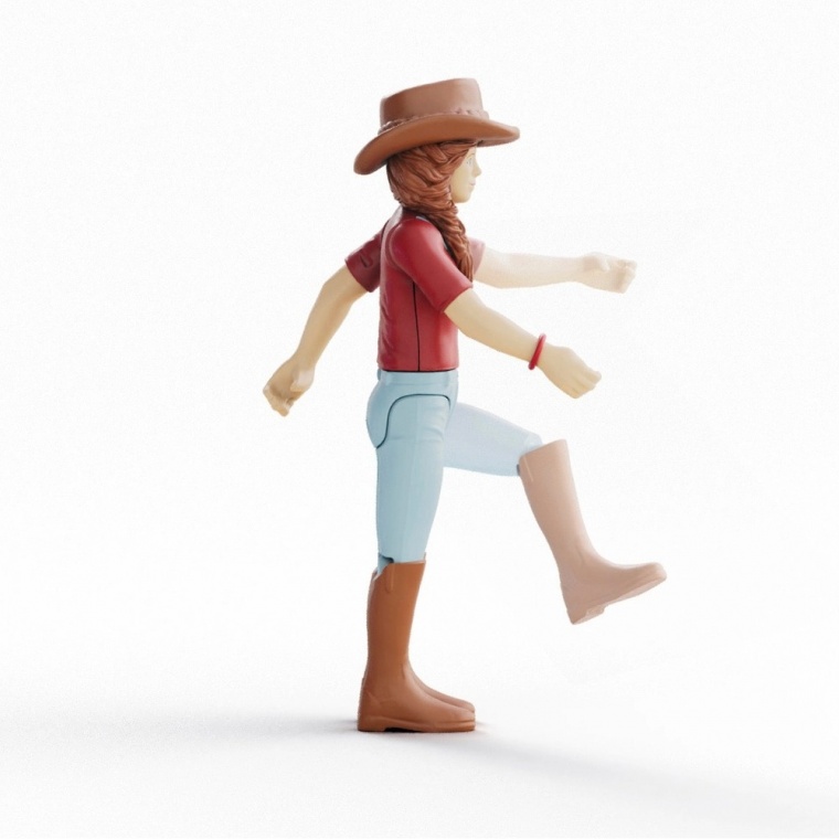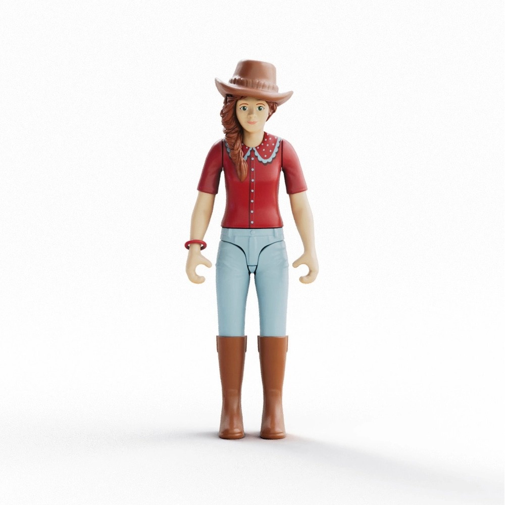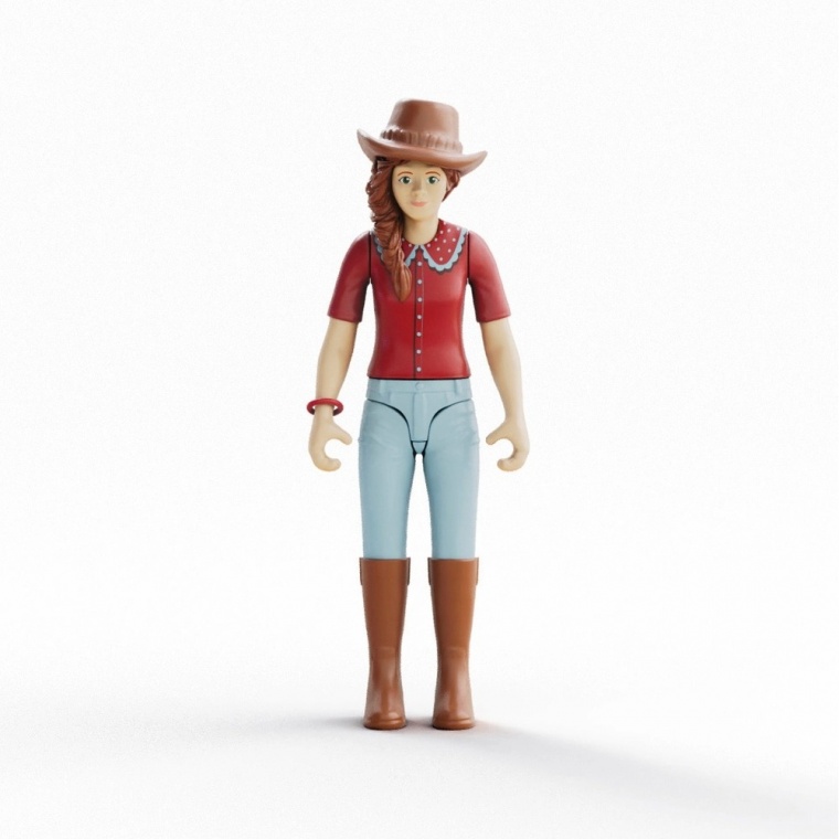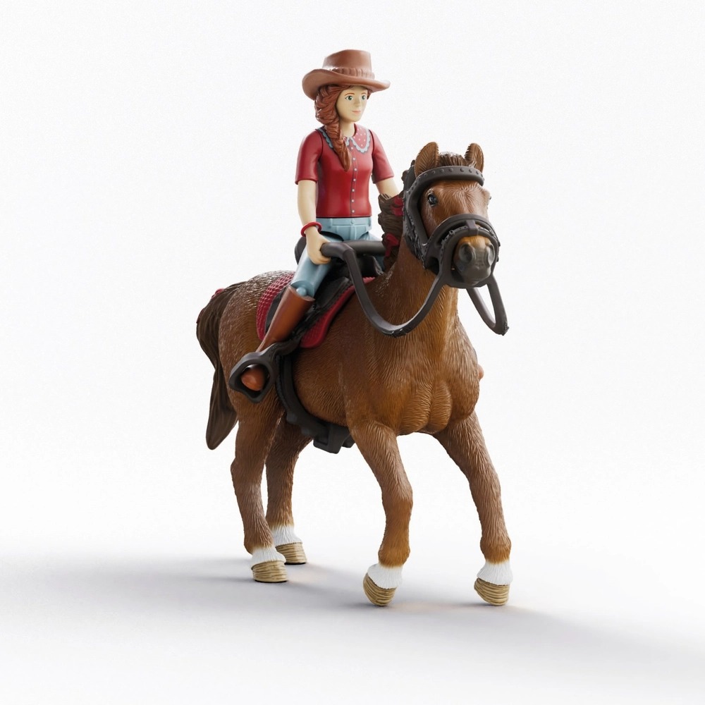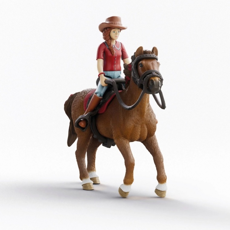 Розміри упаковки: 15,5 х 8,2 х 18 см. Новинка 2025 року. А ось і Ханна і Кайєн, мерін породи квотерхорс. Ханна сидить у сідлі прямо і міцно тримає поводи в руці. Вона ставить темп. Волосся вона зав'язує ззаду, а на голові у неї ковбойський капелюх. Це ідеальний варіант, оскільки вони з Кайєном вважають за краще їздити у стилі вестерн.