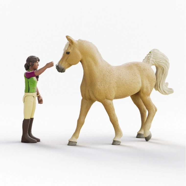 Розміри упаковки: 15,5 х 8,2 х 18 см. Новинка 2025 року. Сара та Містері сяють від радості. Сара любить кататися на своїй арабській кобилі. І симпатичний бежевий Містері відчувається так само. Вона радісно загострює вуха і пирхає в передчутті. Сара гладить гарну білу мітку на лобі і забирається в сідло. Вони виглядають добре!